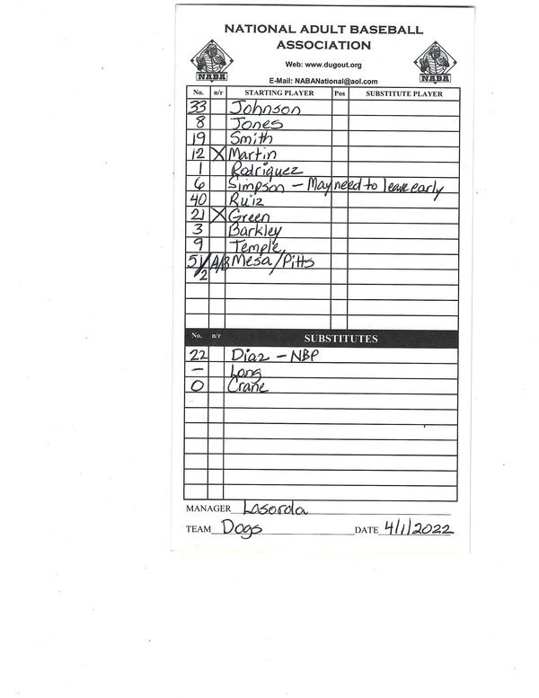 - Lineup cards: List all player's last names and numbers. List your batting order, which will include all non-runner batters (needing a courtesy runner), pool players, A/B batters, non-batting pitchers (NBP), and all reserve players (including non-runner batters).